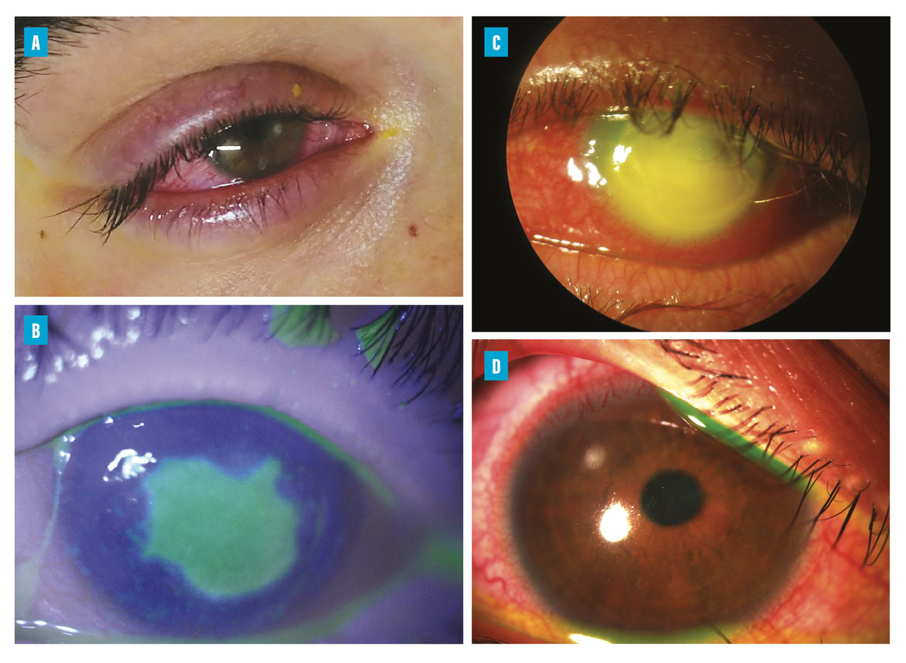 Les symptômes sont peu spécifiques, et devant un œil rouge douloureux avec baisse d’acuité visuelle, il faut penser à éliminer une uvéite antérieure aiguë et un glaucome aigu par fermeture de l’angle.3 Infiltrats périphériques stériles, kératites immunitaires et kératites virales mimant un abcès de cornée sont autant d’autres diagnostics différentiels.