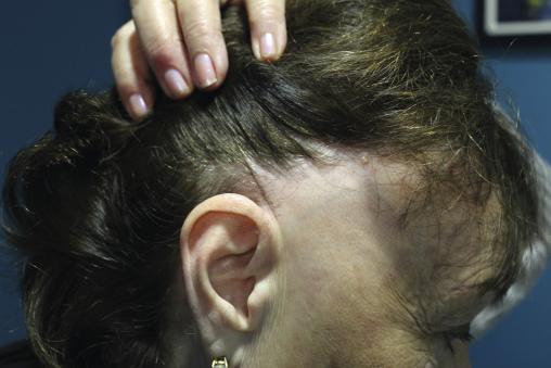 Monique, 72 ans, consulte car elle se « déplume » au-dessus des oreilles. La zone dépourvue de cheveux a un aspect très brillant et lisse.