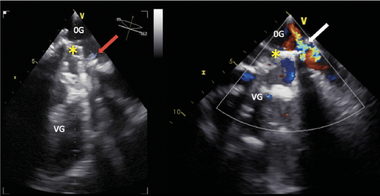 Cette femme de 67 ans avait une asthénie et par intermittence des urines sombres. Une insuffisance mitrale rhumatismale avait été traitée 22 ans auparavant par remplacement valvulaire chirurgical. Le bilan biologique révélait une anémie (7,6 g/dL) normochrome normocytaire régénérative (taux de réticulocytes à 278 000/mm3), un taux de lacticodéshydrogénase à 2 688 UI/L, un taux d’haptoglobine inférieur au seuil de détection et un taux normal de bilirubine totale. Le frottis sanguin (fig. 1 ) notait de très nombreux schizocytes (plus de 500/1 000). L’échocardiographie transœsophagienne (ETO)montrait la présence d’une végétation et une fuite prothétique (fig. 2 ). Il s’agissait d’une endocardite infectieuse à Pseudomonas aeruginosa compliquée d’une désinsertion de valve prothétique.