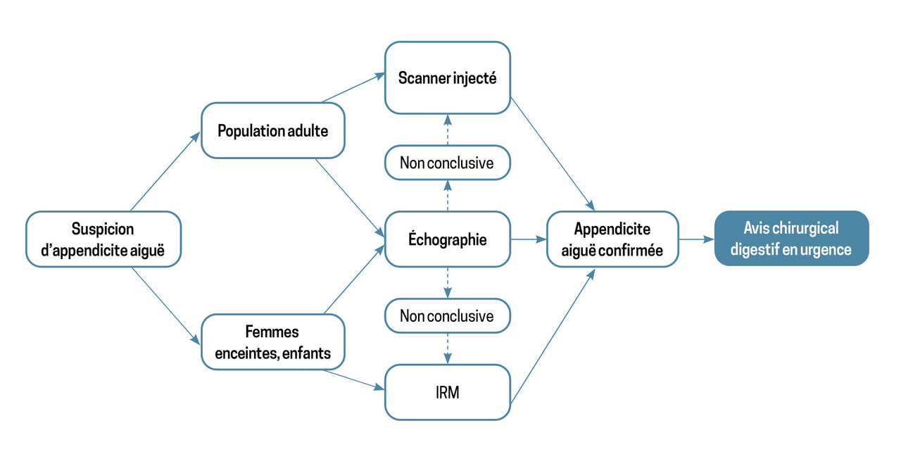 Avant l’ère des explorations radiologiques, la triade fièvre-défense en fosse iliaque droite-hyperleucocytose poussait à l’indication chirurgicale, avec un taux non négligeable (jusqu’à 25 %) d’appendicectomies effectuées sur un appendice sain. La réalisation systématique d’une imagerie abdominale a permis de diminuer significativement le taux d’appendicectomies inutiles. Les recommandations émises par les Sociétés françaises de chirurgie digestive et de radiologie préconisent donc la réalisation systématique d’une imagerie lors de la suspicion clinico-biologique d’appendicite aiguë (fig. 1).