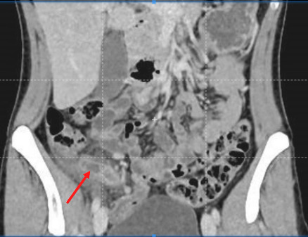 Le scanner abdominopelvien avec injection intraveineuse de produit de contraste est l’examen de référence, avec une excellente performance diagnostique. Il permet, dans le même temps, d’éliminer de nombreux diagnostics différentiels et détermine la présence ou non d’une complication de l’appendicite, telle qu’un abcès ou une péritonite. Le diagnostic positif repose sur une augmentation du diamètre de l’appendice, une infiltration de la graisse périappendiculaire, un épaississement et une prise de contraste de ses parois (fig. 2).