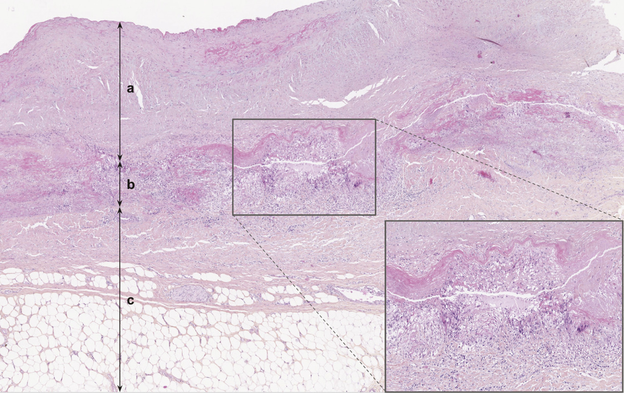 À terme, ces lésions inflammatoires peuvent laisser place à une fibrose cicatricielle diffuse pure, caractérisée par un anneau fibreux médio-adventiciel, qui peut aider au diagnostic.14