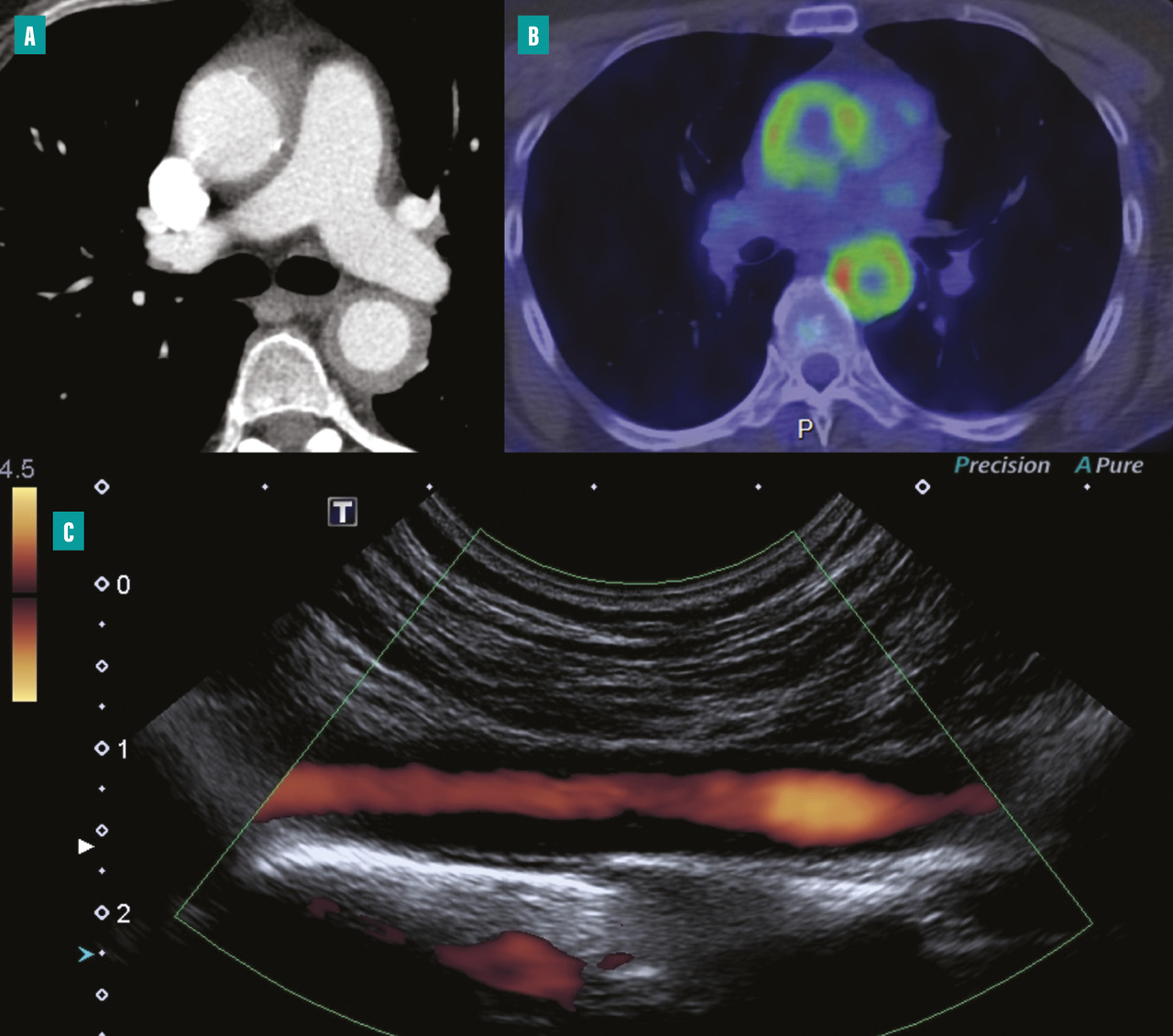 L’une des principales difficultés dans l’artérite de Takayasu est l’évaluation de l’activité de la maladie, que ce soit au diagnostic ou au cours du suivi. La persistance du caractère inflammatoire des lésions artérielles est l’un des principaux facteurs prédictifs de rechute ou de rethrombose en cas de gestes de revascularisation.17 Les signes généraux observés à la phase inflammatoire de la maladie restent peu spécifiques, et les signes d’ischémie artérielle (claudication de membre) ne signent pas forcément une progression de la maladie mais peuvent être secondaires à des lésions fibrosantes quiescentes. Les marqueurs biologiques de l’inflammation (protéine C-réactive [C-reactiv protein [CRP], orosomucoïde, haptoglobine, fibrinogène) ne permettent pas toujours de classer de façon optimale les patients. En ce qui concerne l’évaluation inflammatoire morphologique, notamment par TEP-TDM (tomodensitométrie ou scanner), des seuils de positivité restent à évaluer pour mieux caractériser la nature inflammatoire des lésions, mais cela apporte une aide précieuse dans l’évaluation multimodale de l’activité inflammatoire de la maladie.