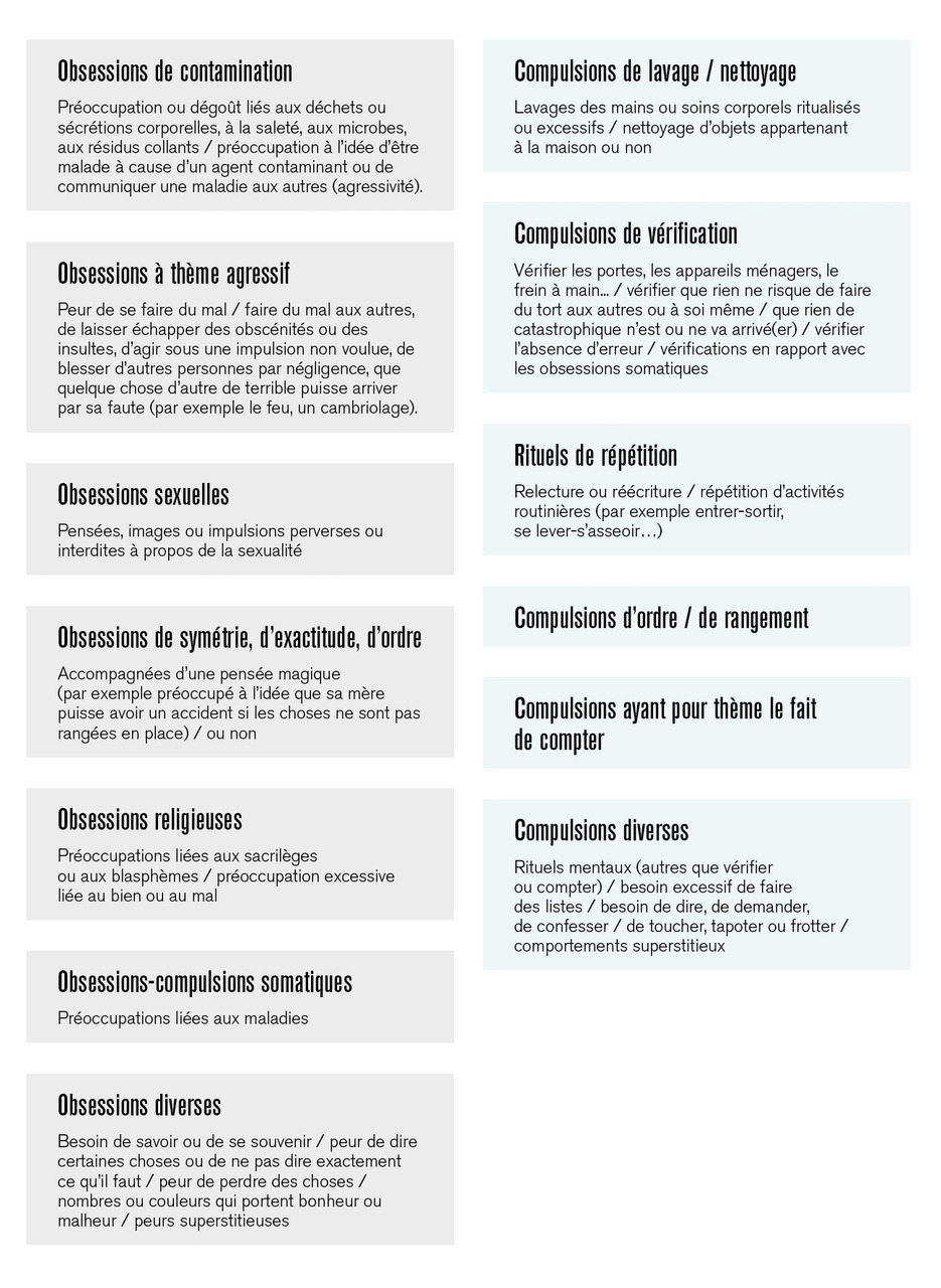 Les obsessions sont parfois plus difficiles à mettre en évidence lors de la première consultation. Ce sont des pensées ou des images, intrusives, répétées, angoissantes et difficiles à rejeter. Généralement, le patient essaye de les diminuer ou de prévenir leur apparition avec les compulsions et les évitements de certaines situations. Les exemples les plus fréquents sont les obsessions de la saleté et la peur de commettre une erreur. Nous avons probablement tous des pensées intrusives (« Est-ce que j’ai bien fermé ma voiture à clé ? »), mais les aspects pathologiques des obsessions résident dans leur répétition, leur caractère fixe, anxiogène et la difficulté à les rejeter.2 Pour mieux les repérer, on peut demander au patient « Que se passerait-il si je vous demandais de ne pas faire votre compulsion ? » et « Pourquoi seriez-vous angoissé ? ». On peut alors mettre en évidence le degré d’anxiété ressenti et l’objectif de la compulsion, qui est souvent de réduire l’angoisse associée à l’obsession.