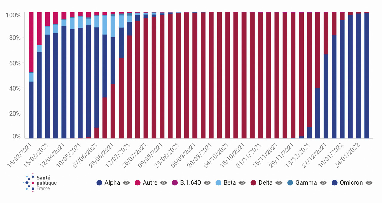 Enfin, le séquençage profond du génome complet viral est la méthode de référence permettant de mettre en évidence un nouveau variant. Ces séquences alimentent les « enquêtes Flash » hebdomadaires mises en place depuis janvier 2021 par Santé publique France, qui cartographient, à un instant donné, les variants circulant sur le territoire français. Ces enquêtes ont mis en évidence en août 2021 la disparition du variant Alpha au profit de Delta puis, en janvier 2022, l’émergence d’Omicron du fait de l’avantage sélectif conféré par ses nombreuses mutations (fig. 3 ).25 Avec l’arrivée d’Omicron, le criblage est devenu un examen indispensable en complément de la sérologie, avant l’instauration d’un traitement par anticorps monoclonaux afin d’adapter la stratégie thérapeutique au variant.