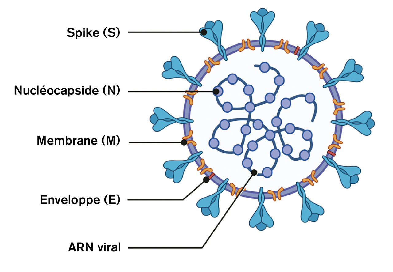 Les CoV sont des virus enveloppés à ARN monocaténaire linéaire non segmenté de polarité positive. La taille de la molécule d’ARN avoisine les 30 kilobases (kb) ; il s’agit du génome à ARN le plus grand qui ait été décrit chez un virus pathogène pour l’homme. L’organisation du génome du SARS-CoV-2 comprend deux régions non codantes (untranslated regions, ou UTR) en 5’ et 3’ et une partie, constituée de 10 à 12 ORF (open reading frame), codant pour des protéines structurales (dont la nucléoprotéine, la protéine Spike, les protéines de membrane et d’enveloppe) et pour des protéines non structurales impliquées notamment dans la réplication virale.1 L’ARN monocaténaire est encapsidé par la nucléoprotéine (N) formant la nucléocapside, l’ensemble étant protégé par l’enveloppe virale. L’enveloppe est composée par la protéine de membrane (M), la protéine d’enveloppe (E) et la protéine Spike (S) organisée en couronne à la surface de cette dernière (fig. 1 ).1