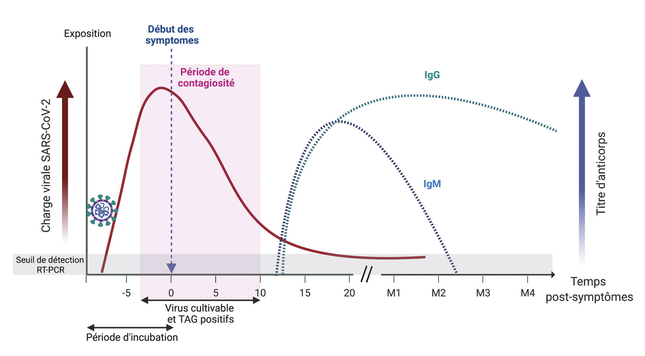 La production d’anticorps spécifiques dirigés contre le SARS-CoV-2 commence, en général, après la première semaine d’infection ; la majorité des patients développent des immunoglobulines spécifiques (IgG et IgM) en dix à quinze jours, qui sont détectables par les méthodes sérologiques. Les IgG persistent alors que le taux d’IgM diminue dès le premier mois (fig. 2 ).16, 17