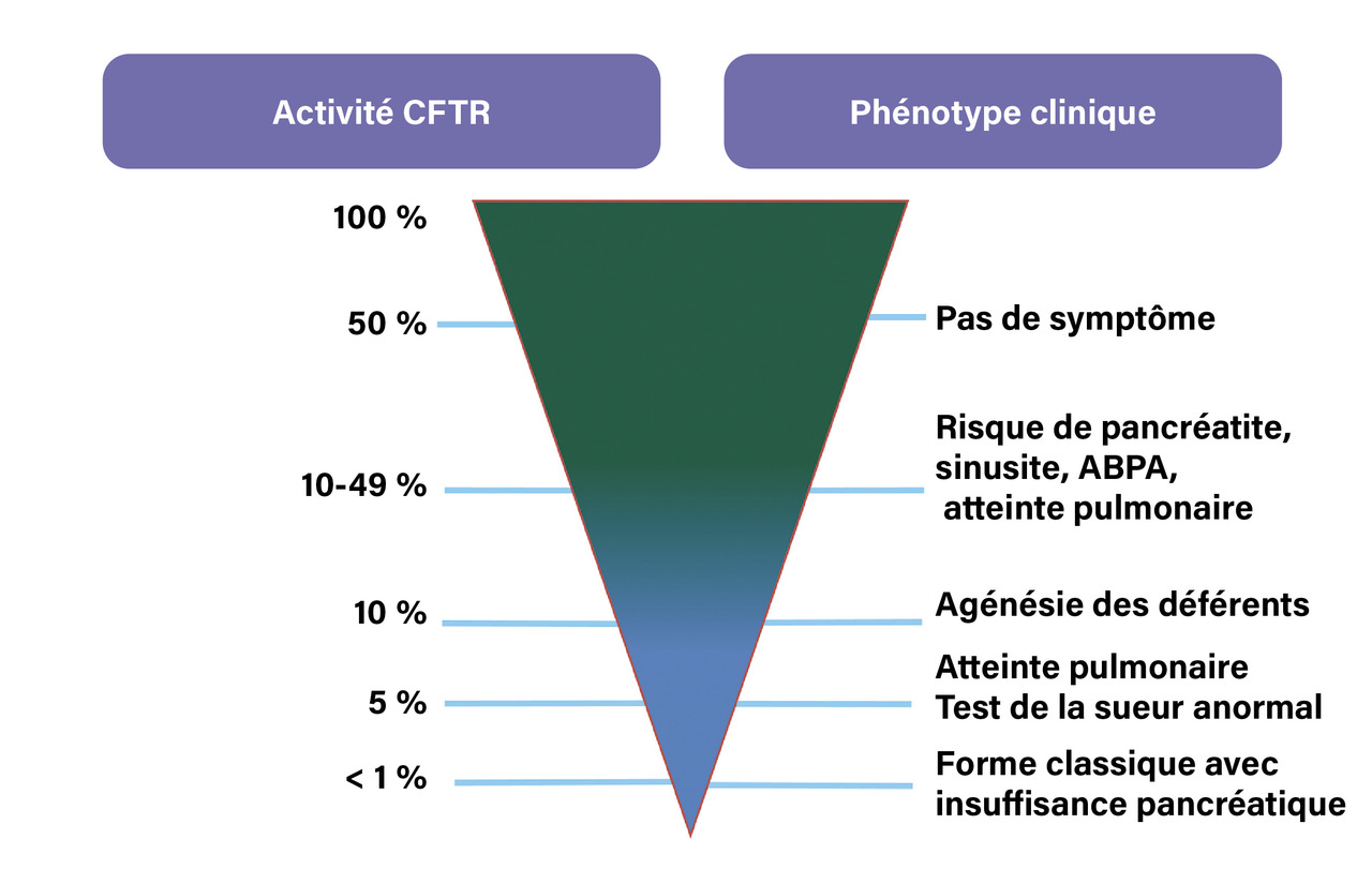 Les mutations de classes IV, V et VI sont généralement responsables de formes plus modérées de la maladie car associées à la présence d’une protéine partiellement fonctionnelle. La corrélation entre le génotype et le phénotype clinique est complexe et globalement peu prévisible d’emblée sauf pour le pancréas, dont la fonction exocrine est atteinte très précocement et de façon définitive dans les formes classiques de la maladie (
