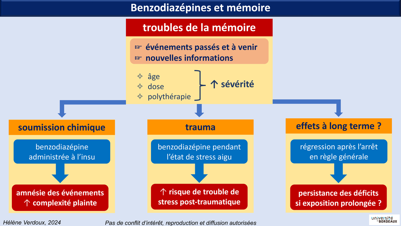 Du fait de ces effets amnésiants, il est vivement déconseillé de prendre des benzodiazépines pour diminuer l’anxiété immédiatement après l’exposition à un événement traumatique. Cela aggrave les perturbations aiguës de la mémoire générées par le trauma et augmente le risque de développer un trouble de stress post-traumatique.