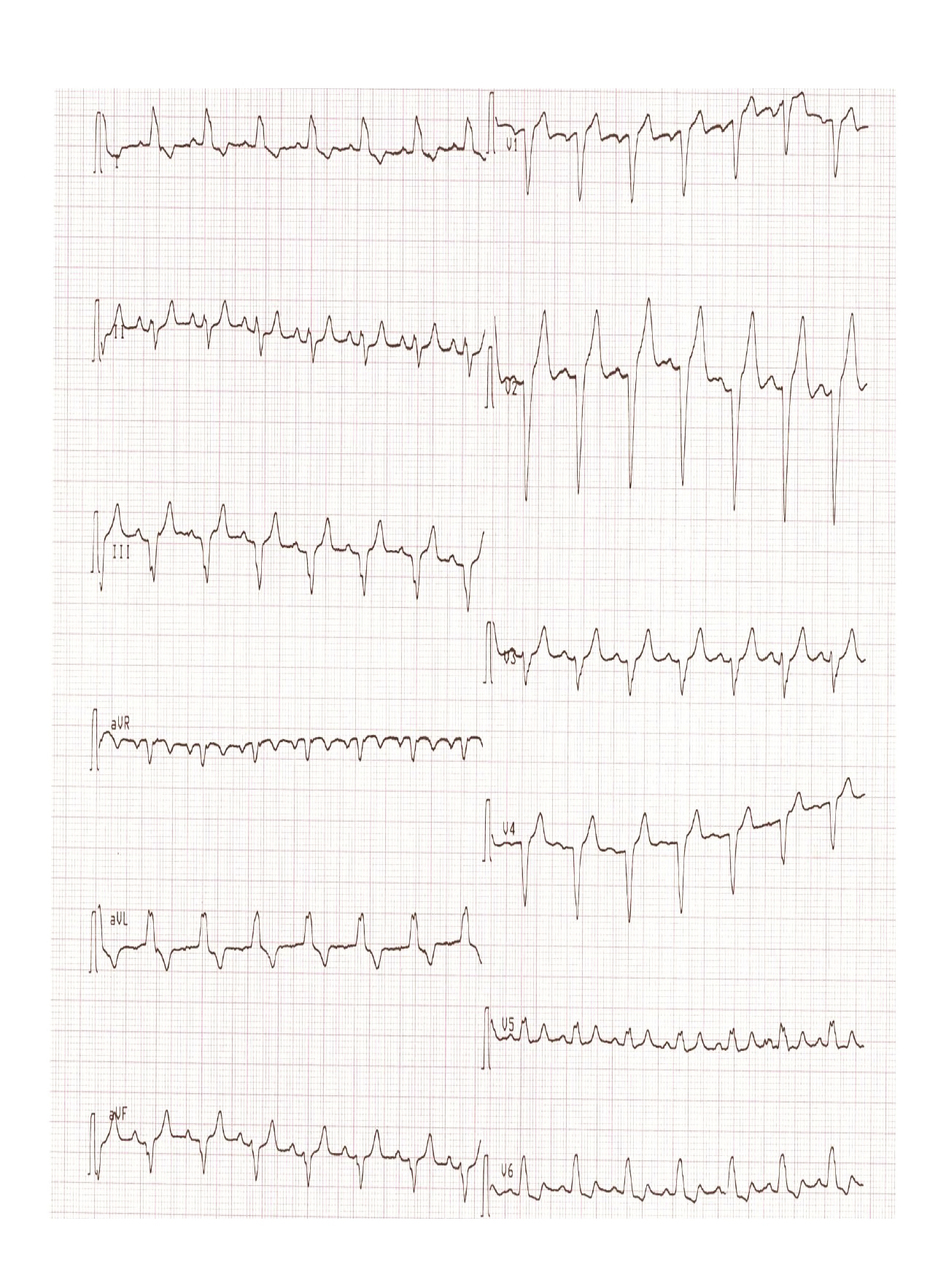 Mme M, 53 ans, secrétaire au cabinet médical avec une hypothyroïdie substituée, avait ressenti soudainement une douleur thoracique avec angoisse et palpitations. L’électrocardiogramme (ECG) initial était rassurant (fig. 1 ) et les symptômes disparaissaient pour réapparaître 15 minutes plus tard. Un nouvel ECG (fig. 2 ) montrait un bloc de branche gauche complet. Transportée aux urgences, le premier bilan ne notait ni élévation des troponines ni autre anomalie biologique. L’ECG revenu à la normale, elle était hospitalisée pour un bilan approfondi : la coronarographie et la scintigraphie myocardique ne montraient pas d’ischémie ; l’épreuve d’effort notait à nouveau un bloc de branche gauche. Devant ce bloc intermittent chronodépendant, un traitement par bêtabloquant était prescrit.