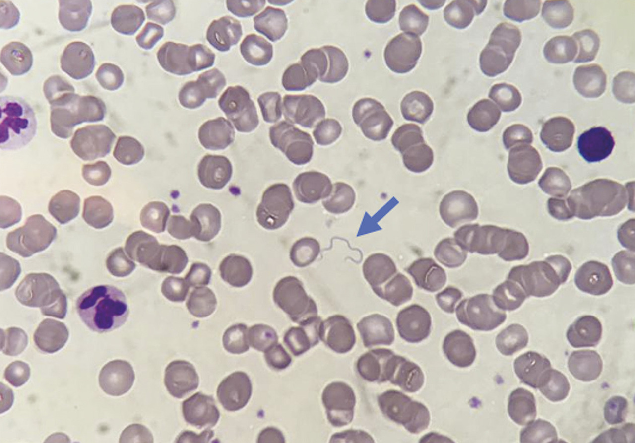 Durant les accès fébriles des BR, la bactériémie (ou spirochétémie) est élevée, mais la bactérie ne pousse pas sur des hémocultures standard. Afin de la mettre en évidence, il existe plusieurs méthodes. La plus ancienne est la détection par microscopie optique sur frottis sanguin après coloration de May-Grünwald-Giemsa (fig. 3 ). Néanmoins, elle expose à un risque de faux négatif en cas de faible concentration bactérienne.8