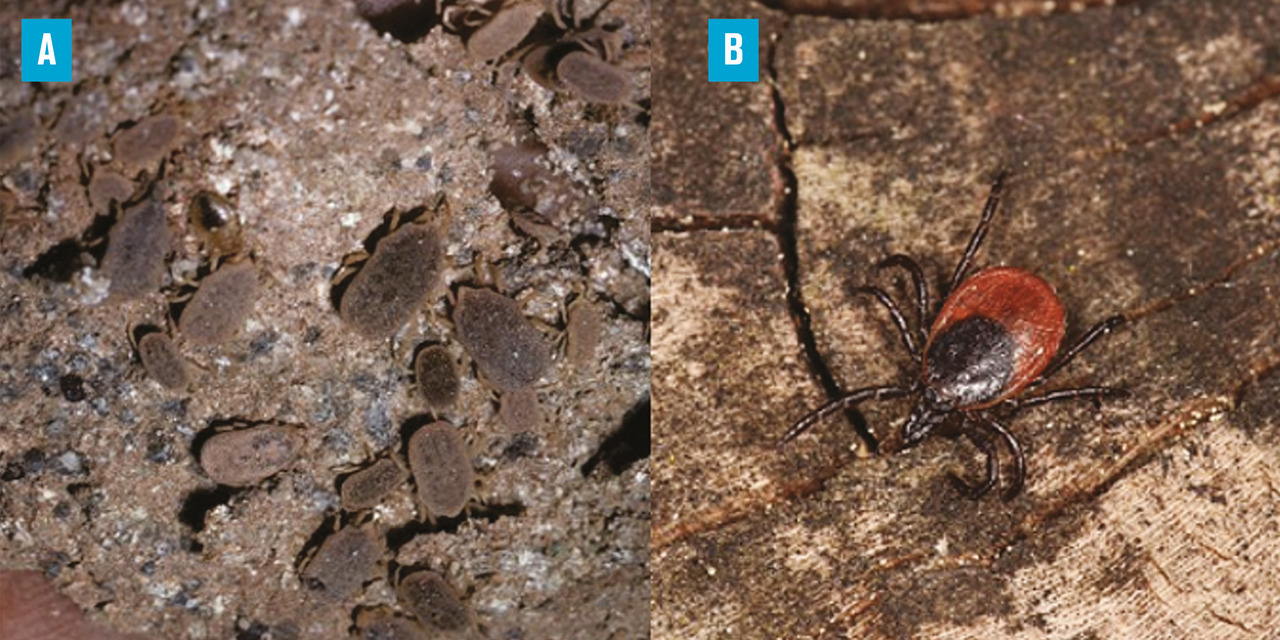 Au sein des borrélioses récurrentes, on distingue celles qui sont transmises par les poux de corps (Pediculus humanus corporis) (fig. 1 ) et celles qui sont transmises par des tiques (tiques molles du genre Ornithodoros et tiques dures du genre Ixodes pour l’une d’entre elles) [fig. 2 ]. De ces modes de transmission découlent les principales caractéristiques épidémiologiques de ces infections (tableaux 1 et 2 ).