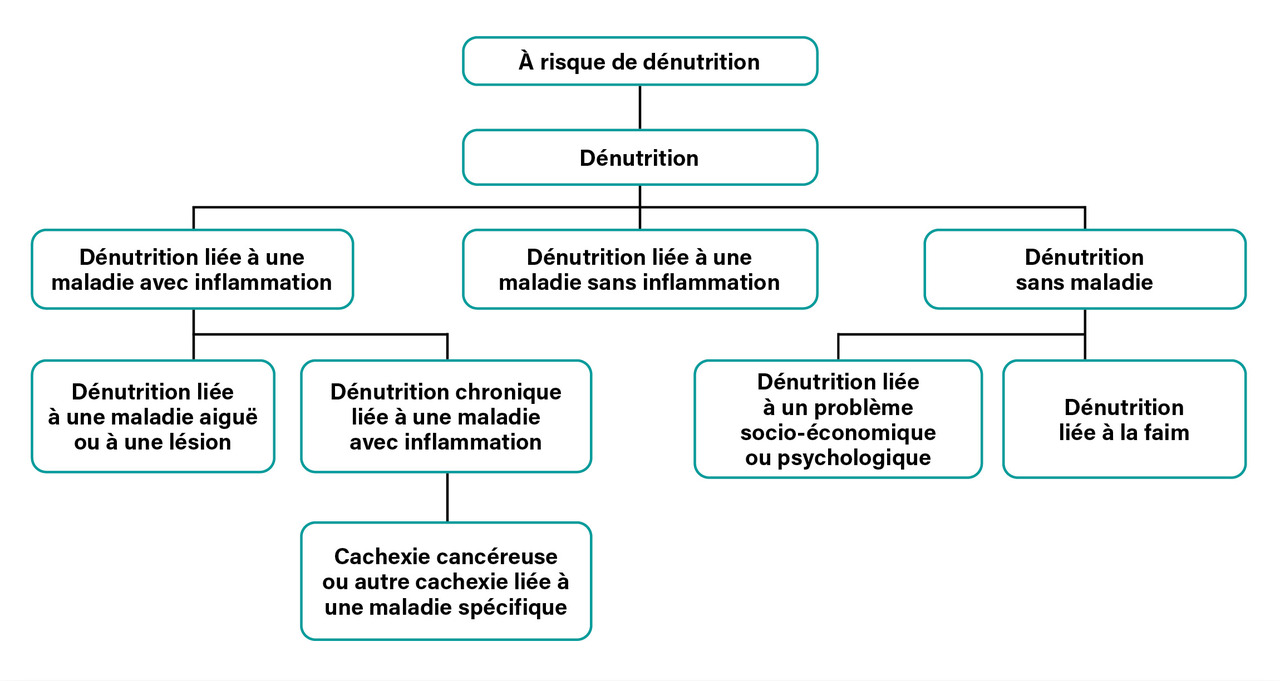 Ce déséquilibre nutritionnel peut être retrouvé dans trois situations en médecine générale : en l’absence de maladie (liée à la faim, à des problèmes socio-économiques ou psychologiques), lié à une maladie sans inflammation (par exemple, l’anorexie mentale) ou lié à une maladie avec inflammation aiguë ou chronique (par exemple, une pneumopathie, une escarre, une maladie inflammatoire chronique de l’intestin, un cancer) [
