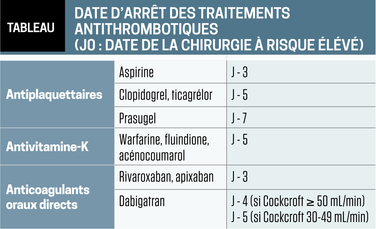 Cette décision revient à l’équipe médicochirurgicale qui a prévu l’intervention, elle fait partie de la consultation d’anesthésie. Elle dépend du type de traitement pris, du risque thrombotique du patient et du risque hémorragique lié à la chirurgie. Plusieurs référentiels l’ont harmonisée.1, 3