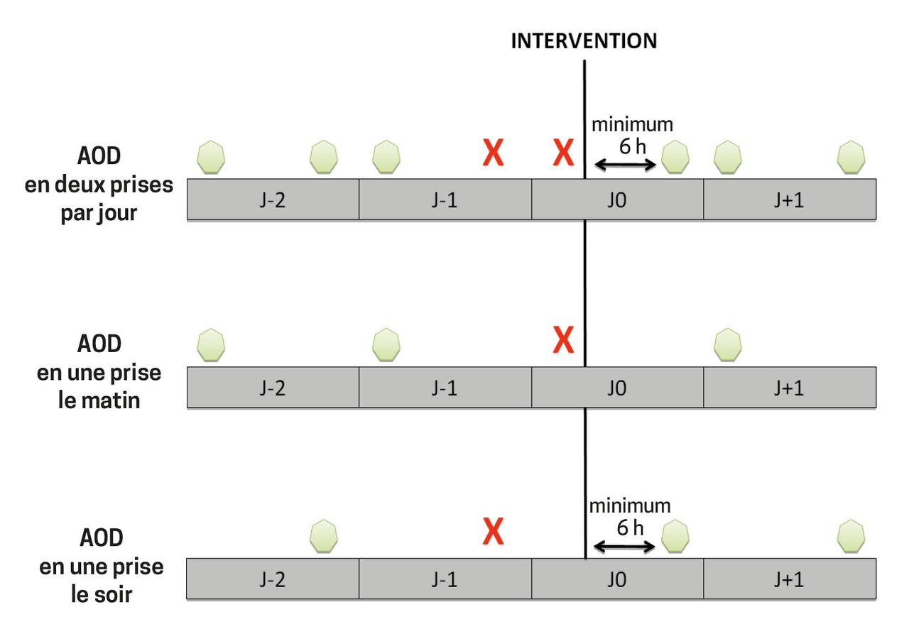 Pour les AOD, supprimer la prise de la veille au soir et celle du matin de l’intervention (si 2 prises/j ;figure ).