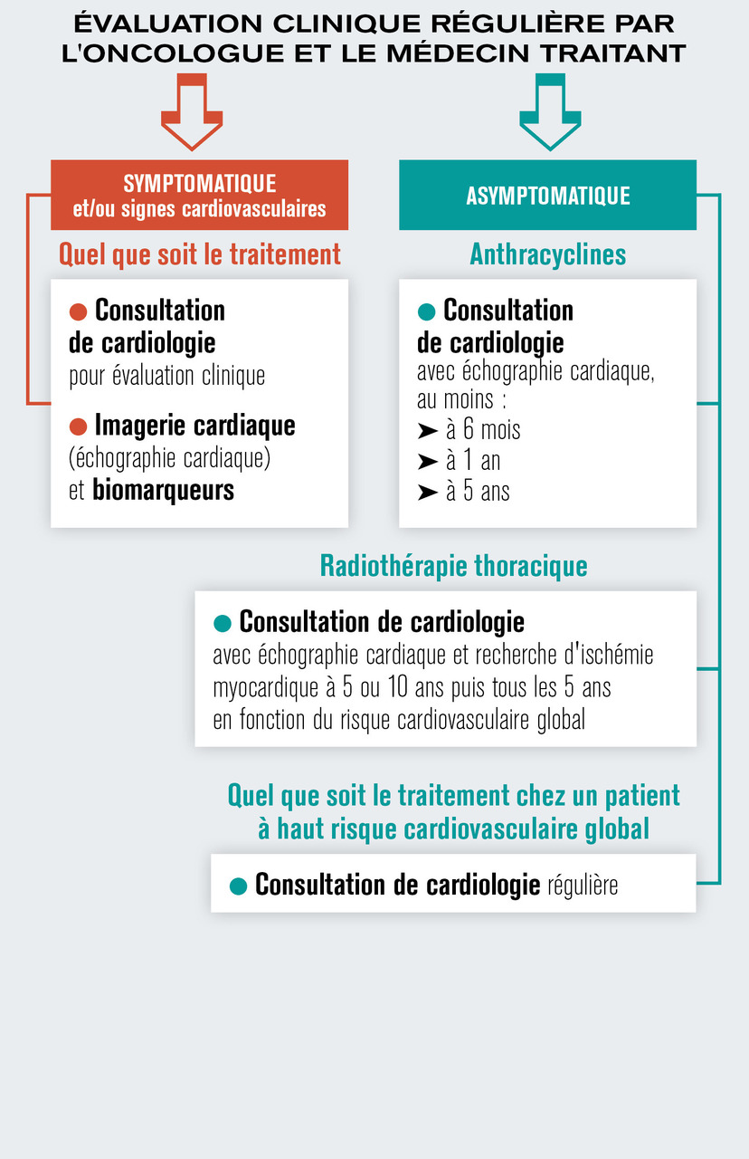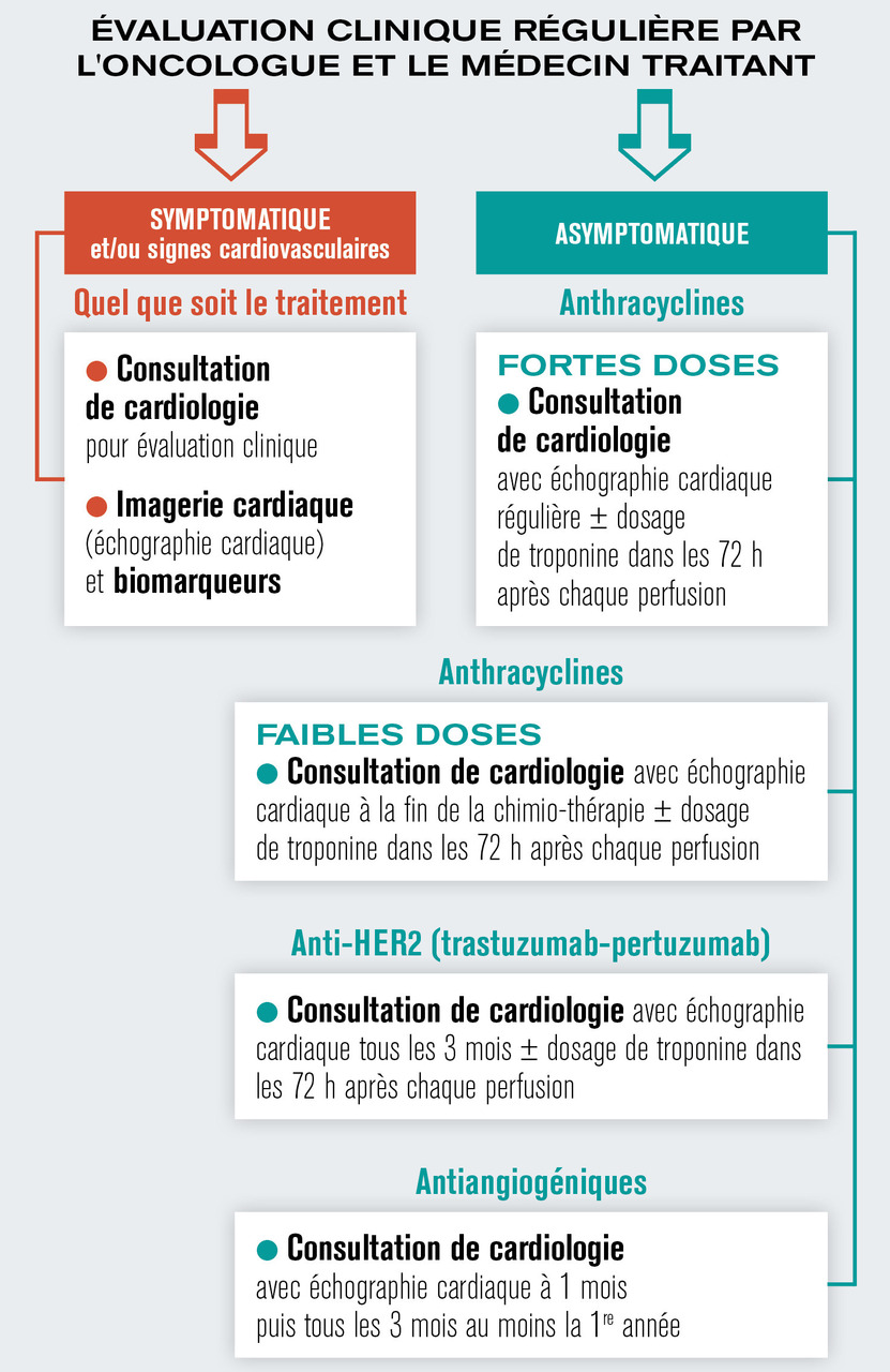 Au cours des consultations de suivi, il est crucial d’optimiser le traitement des comorbidités cardiovasculaires et d’inciter les patients à une bonne hygiène de vie incluant si possible l’activité physique. Les modalités précises de suivi dépendent de l’apparition ou non de symptômes et/ou de signes cardiovasculaires, ainsi que du traitement anticancéreux administré, comme cela est résumé dans la