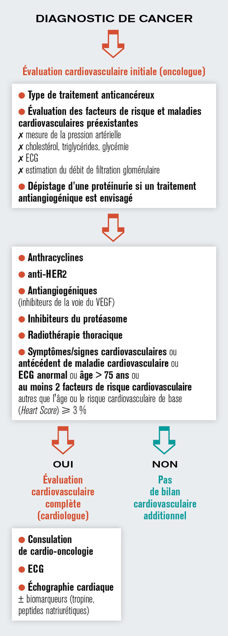 Récemment, les sociétés savantes européennes et américaines de cardiologie et d’oncologie ont souligné l’importance d’identifier très tôt les patients à risque de complications cardiovasculaires dès le diagnostic de cancer.2, 3 Ce risque dépend tout d’abord du caractère toxique du traitement envisagé mais également des antécédents cardiovasculaires des patients. En effet, les toxicités sont plus fréquentes en cas d’utilisation de certaines molécules comme les anthracyclines, les anti-HER2 (trastuzumab, pertuzumab), les antiangiogéniques ou d’autres thérapies ciblées spécifiques. Cependant, quel que soit le traitement administré, le risque de toxicité est également plus important chez les patients ayant des facteurs de risque ou déjà atteints d’une maladie cardiovasculaire.4 Par exemple, l’hypertension artérielle est la comorbidité la plus fréquente chez les patients cancéreux et peut contribuer à l’apparition d’une insuffisance cardiaque.5, 6 Il a également été démontré que la probabilité d’une insuffisance cardiaque causée par les anthracyclines et le trastuzumab était significativement plus élevée avec l’augmentation de l’âge, la présence d’une artériopathie périphérique ou coronarienne, le diabète et l’hypertension artérielle.7 Ainsi, le risque cardiovasculaire basal doit systématiquement, avant tout traitement, faire l’objet d’une évaluation clinique (recherche d’antécédents, de facteurs de risque, de symptômes et de signes cardiovasculaires), d’un électrocardiogramme (ECG), d’une estimation du débit de filtration glomérulaire, d’une mesure du taux de cholestérol sérique, des triglycérides et de la glycémie. L’estimation de ce risque peut s’envisager en utilisant certains scores validés comme le HeartScore*. Le dépistage d’une protéinurie doit également être effectué lorsque la prescription d’antiangiogéniques est envisagée.1