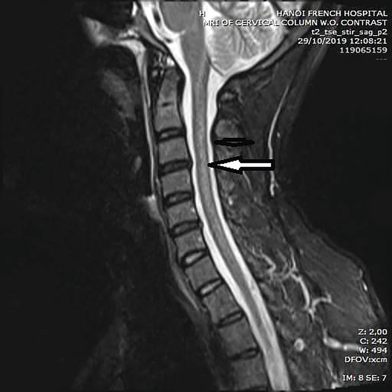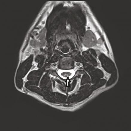 Cet homme de 36 ans, sans antécédent particulier, consultait pour des sensations de peau cartonnée aux pieds et aux mains évoluant depuis trois semaines. Il rapportait la consommation journalière depuis un mois de 40 ballons de protoxyde d’azote (NO). L’examen notait la présence d’un signe de Lhermitte déclenché par l’antéflexion céphalique, des réflexes ostéotendineux vifs et symétriques, une apallesthésie des membres inférieurs et une sensibilité superficielle préservée, sans déficit moteur associé. Le bilan biologique montrait un déficit en vitamine B12 à 179 pg/mL (211-911) et une homocystéinémie supérieure à 50 µmoles/L (5-15). L’IRM cervicale montrait une lésion médullaire postérieure étendue, localisée aux cordons postérieurs (fig. 1 et 2 ).