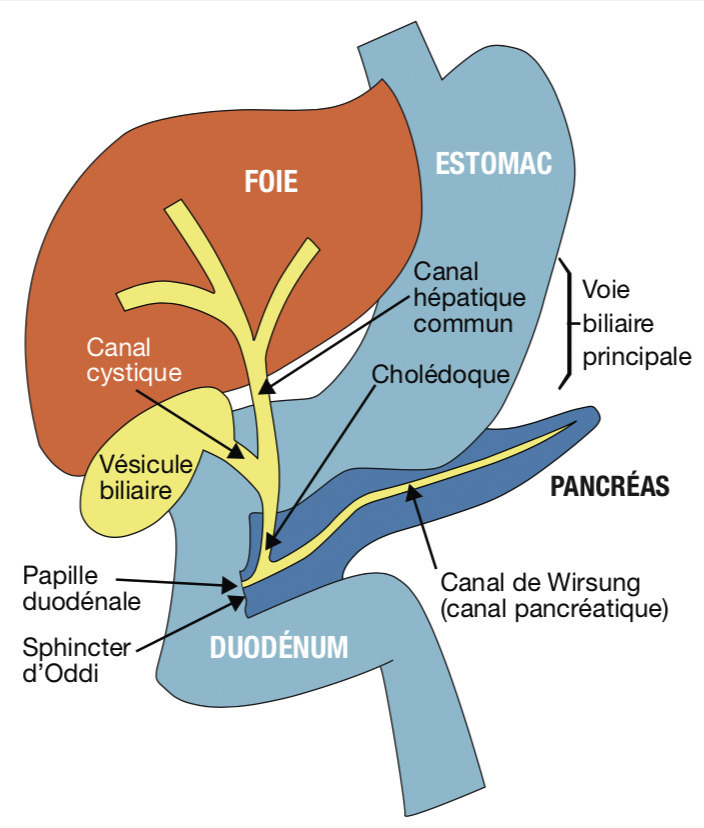 – obstacle sur les voies biliaires : lithiase, cancer de la voie biliaire principale, sténose postopératoire, compression par une adénopathie ou une tumeur de voisinage, parasite (douves, ascaris).