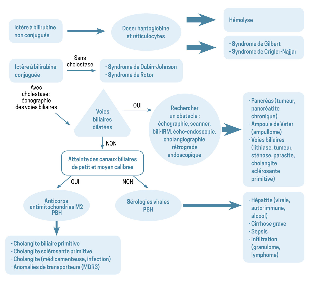 Les causes sont classées en fonction de la présence, ou non, d’un obstacle sur les voies biliaires.