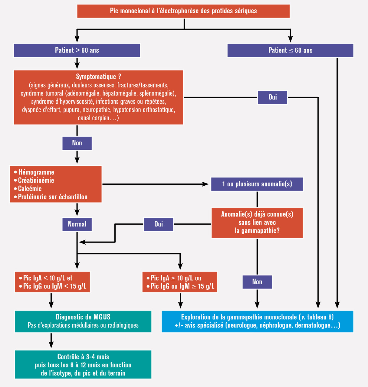 – Lorsque ces explorations préliminaires sont normales, l’enquête est poursuivie en fonction du type d’immunoglobuline monoclonale et du taux du composant monoclonal : si le taux du composant monoclonal est inférieur à 15 g/L (IgG ou IgM) ou 10 g/L (IgA), aucune enquête complémentaire n’est nécessaire dans l’immédiat, et le diagnostic de MGUS peut être retenu ; si le taux du composant monoclonal est supérieur à 15 g/L (IgG ou IgM) ou 10 g/L (IgA), il est nécessaire de poursuivre les explorations à la recherche d’une hémopathie maligne (tableau 6).