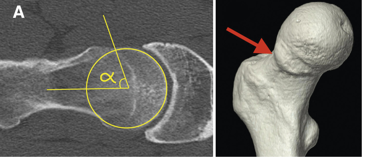 L’association de symptômes douloureux et de radiographies évocatrices confirme le diagnostic. Une imagerie en coupes et injectée (arthroscanner ou arthro-IRM) précise les lésions cartilagineuses et labrales. Une reconstruction 3D montre la bosse fémorale en vue d’une éventuelle résection (fig. 1).