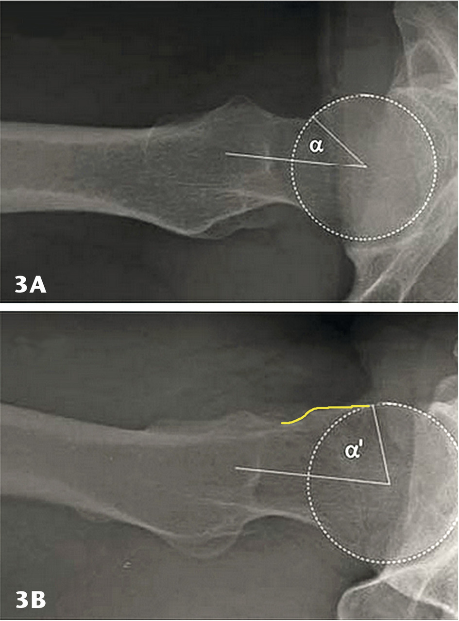 Les radios standard comportent des clichés du bassin, face et profil (bassin de face debout en charge). On peut voir un effet pince avec une éventuelle rétroversion acétabulaire, une coxa profunda avec protrusion acétabulaire. L’effet came est recherché en incidence spécifique : le profil de Dunn à 45°. Il déroule le col fémoral pour mettre en évidence sa « bosse » et la perte de sphéricité de la tête (fig. 3). On peut ainsi calculer l’angle alpha, norma-lement inférieur à 50°. Au-delà de 50°, il y a conflit par effet came.
