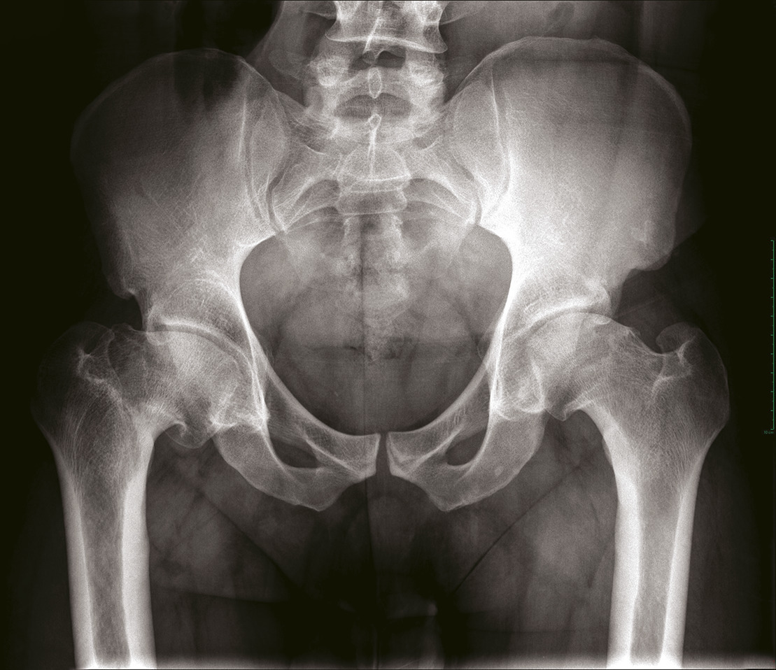 Le bilan radiographique comprend des clichés en charge : bassin de face et faux profil de Lequesne. Les radiographies permettent de confirmer le diagnostic (pincement articulaire, géodes et ostéophytes) [fig. 3 ]. Elles permettent de rechercher une anomalie architecturale sous-jacente (dysplasie, séquelle de maladie de l’enfance). En cas de doute diagnostique ou en cas de pathologies intriquées (rachis : cruralgie-coxarthrose), un test à la xylocaïne peut être réalisé. Ce test consiste à injecter quelques millilitres de xylocaïne à 2 % au niveau de l’articulation coxo-fémorale. La disparition de la douleur dans le quart d’heure qui suit la procédure signe la responsabilité de la hanche dans les douleurs du patient ; ce test permet de prédire le résultat que le patient pourrait espérer d’une arthroplastie totale de hanche.