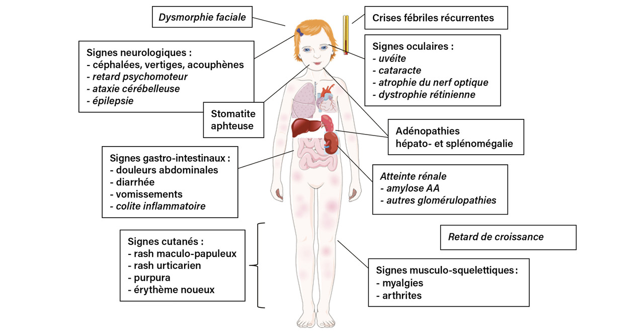 Le spectre clinique variable et continu dépend en partie de l’activité résiduelle de la mévalonate kinase, allant du syndrome hyper-IgD (HIDS ; déficit partiel) à l’AM (déficit complet).2,6 Il n’est pas toujours aisé de distinguer le HIDS et l’AM. Le délai diagnostique peut être long. Néanmoins, il tend à diminuer. En effet, dans le registre Eurofever, le délai diagnostique était de 2,5 ans (0,1-8,3).6