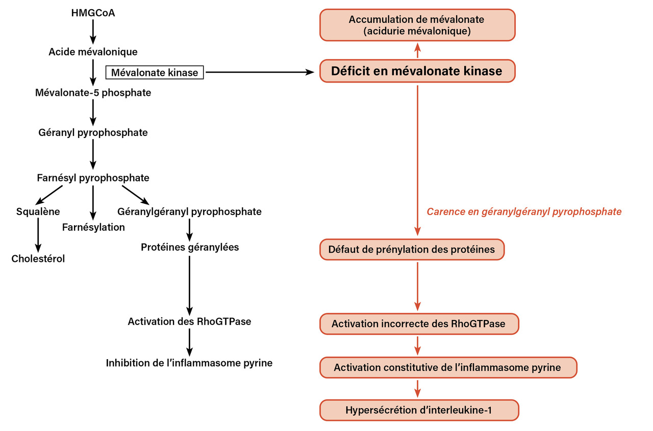 Le MKD est lié à des mutations dans le gène MVK codant pour la mévalonate kinase, une enzyme située sur la voie de synthèse du cholestérol et des isoprénoïdes non stérols (fig. 1 ).3 Des études ont montré que la pénurie temporaire de géranylgéranyl pyrophosphate, causée par le blocage (temporaire) de leur synthèse, affecte la prénylation (farnésylation et géranylgéranylation) des protéines dans le MKD.4 Le groupe le plus important de protéines prénylées est constitué par les petites protéines G (GTPases de la famille RAS/RHO). Des études ont établi un lien entre l’altération de la géranylgéranylation des petites GTPases dans le MKD et l’activation de la pyrine.5 L’activation de l’inflammasome de la pyrine entraîne l’activation de la caspase 1 et la libération ultérieure d’interleukine 1β (IL-1β) et d’IL-18 actives.