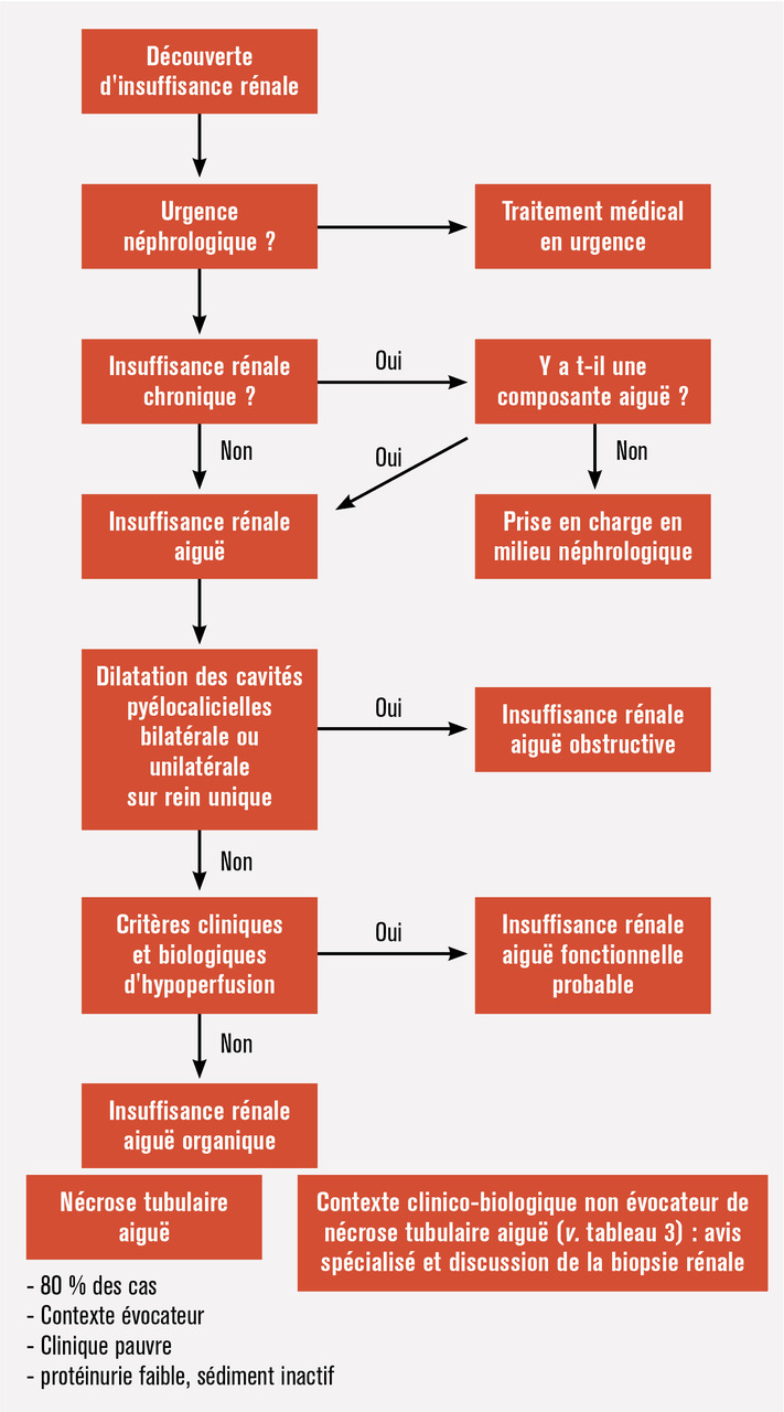 L’algorithme diagnostique (v. figure) devant une insuffisance rénale aiguë consiste donc, après avoir recherché une menace vitale, en l’élimination de causes pré- et post-rénales accessibles à des traitements simples (drainage, réhydratation, etc.). Si ces deux causes sont éliminées, la détermination d’une cause parenchymateuse (largement dominée en pratique par la nécrose tubulaire aiguë, notamment en contexte hospitalier) repose sur un faisceau d’arguments cliniques, radiologiques et biologiques, rénaux et extra-rénaux. La biopsie rénale reste le plus souvent indispensable chaque fois que l’insuffisance rénale aiguë est parenchymateuse et qu’une nécrose tubulaire aiguë est jugée improbable.