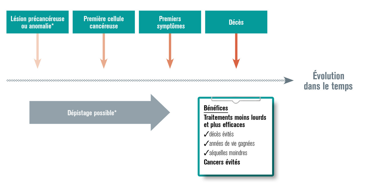 L’objectif est d’anticiper la survenue des symptômes pour favoriser une détection précoce du cancer, le cas échéant des lésions à un stade précancéreux. Le test peut également porter sur une anomalie indirectement liée à un cancer ; par extension, il peut s’agir de la recherche d’une prédisposition, par exemple génétique. Un dépistage ne vaut pas diagnostic et devra, s’il est positif, être suivi d’une exploration complémentaire. On attend ensuite que le diagnostic précoce qui sera posé permette d’influencer favorablement le pronostic par la mise en route précoce d’un traitement, ou par extension d’une surveillance médicale, voire d’un protocole préventif en cas d’identification d’une prédisposition. Du fait de la meilleure efficacité des traitements et de leur moindre lourdeur, des bénéfices sont ainsi escomptés en termes de décès évités, d’années de vie gagnées et de minimisation des séquelles (
