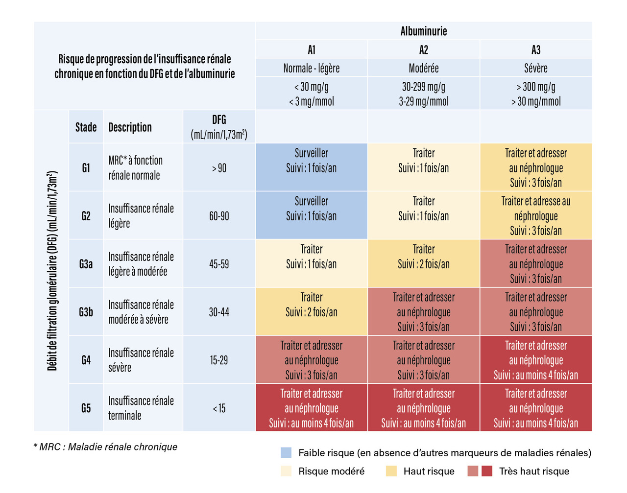 La MRC est une affection en constante progression. Son impact sur l’altération de la fonction rénale, les complications cardiovasculaires et la qualité de vie nécessite une prise en charge pluridisciplinaire. Le rôle du médecin généraliste est central pour le dépistage de la MRC. Après le diagnostic, un faible nombre de ces patients devront être adressés en urgence au néphrologue pour investigations et prise en charge. Mais dans tous les cas, la mise en place rapide par le médecin généraliste de mesures de néphroprotection permettra une stabilisation efficace de la maladie avant adressage au spécialiste.