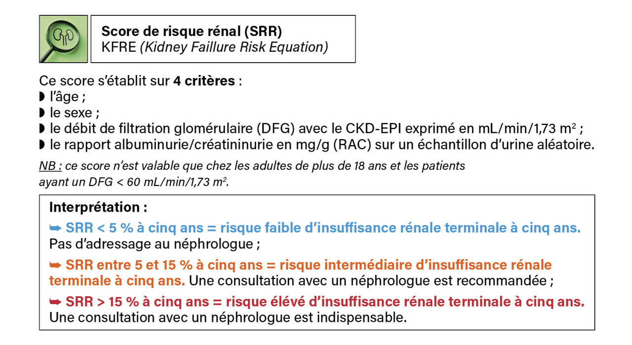 Après obtention des résultats, la nécessité de l’adressage au médecin spécialiste dépend du risque de progression de la MRC. L’évaluation du risque de progression tient compte du DFG et de la protéinurie. La « heat map » (fig. 1) et le calcul du score de risque rénal (KFRE) [fig. 2] sont deux outils qui permettent une évaluation facile et rapide du risque de progression.