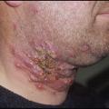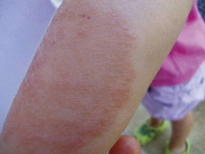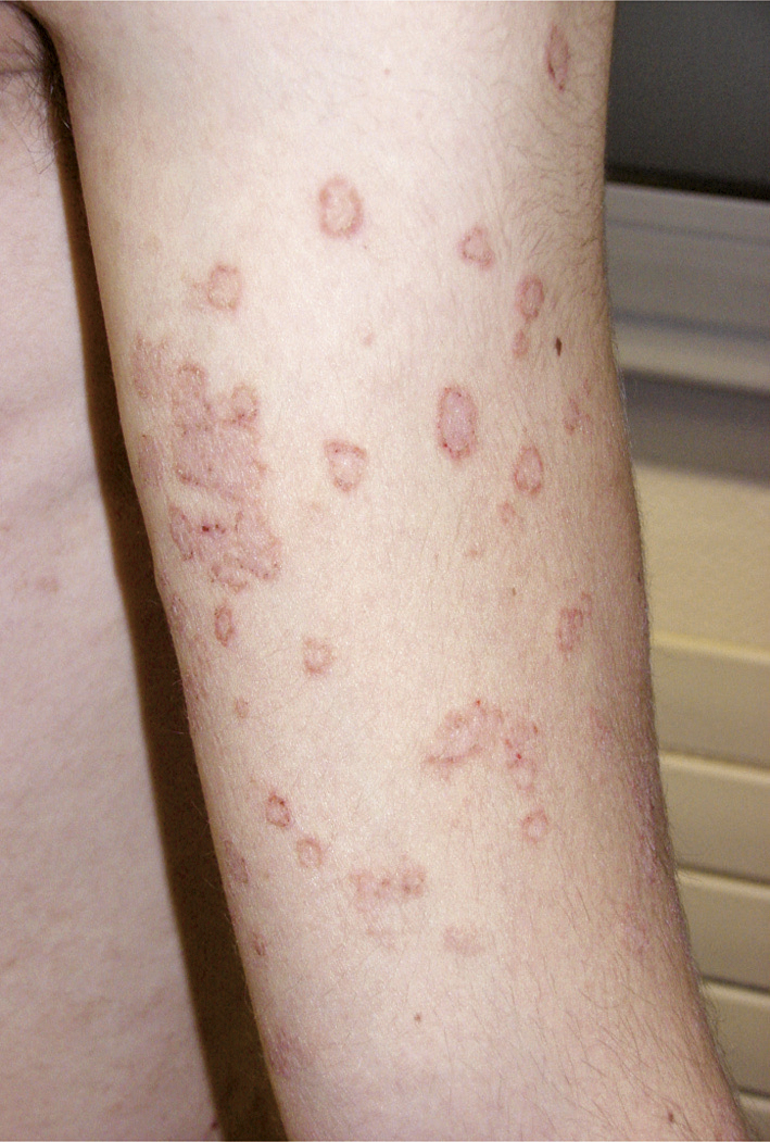 L’herpès circiné débute par une petite macule érythémateuse plus ou moins prurigineuse, qui s’étend ensuite de manière concentrique pour atteindre 4-5 cm de diamètre (fig. 1). La peau, normale au centre, a en périphérie un aspect inflammatoire, papuleux, squameux, voire vésiculeux. Parfois, plusieurs zones concentriques s’observent sur une même lésion. En cas de contacts fréquents avec l’animal (lit partagé), ou de déficit immunitaire (corticothérapie, diabète, cirrhose, insuffisance surrénalienne, sida), les lésions sont multiples (fig. 2).