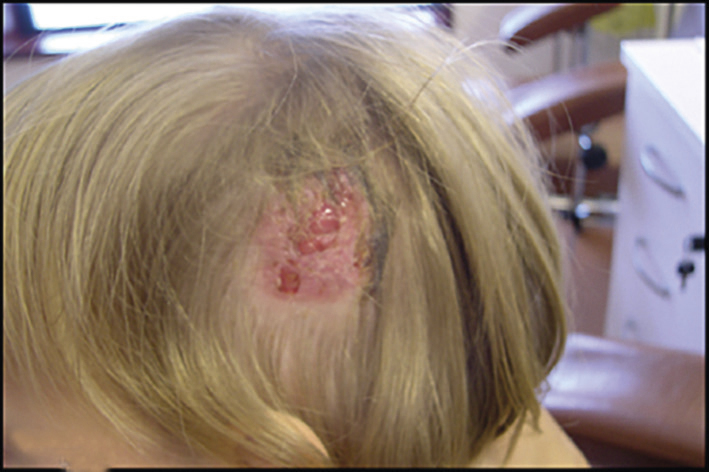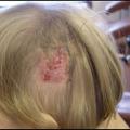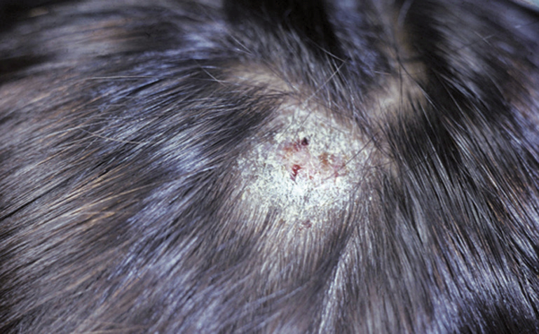 Les teignes surviennent essentiellement chez les enfants avant l’âge de la puberté. Les microsporiques (fig. 3 et 4) sont fluorescentes sous lampe de Wood (cheveux et poils colorés en vert). Les trichophytiques sont souvent très inflammatoires et suppurées (fig. 5). Les plaques érythémato-squameuses initiales deviennent confluentes, se couvrent ensuite de pustules purulentes, provoquant l’expulsion du cheveu. L’inflammation est d’autant plus marquée que le patient a reçu un traitement local par corticoïdes avant d’être adressé au mycologue.