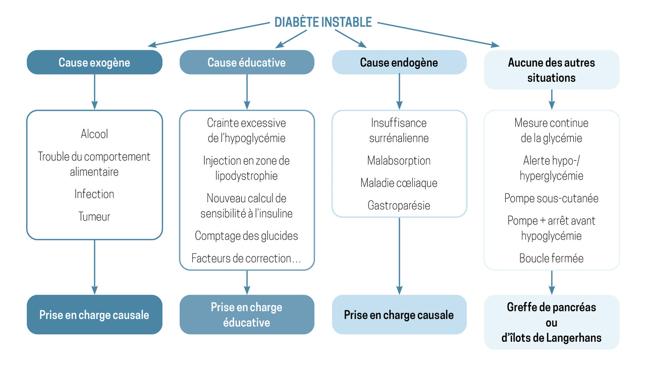 En cas d’instabilité glycémique, il convient de rechercher une cause organique ou comportementale (