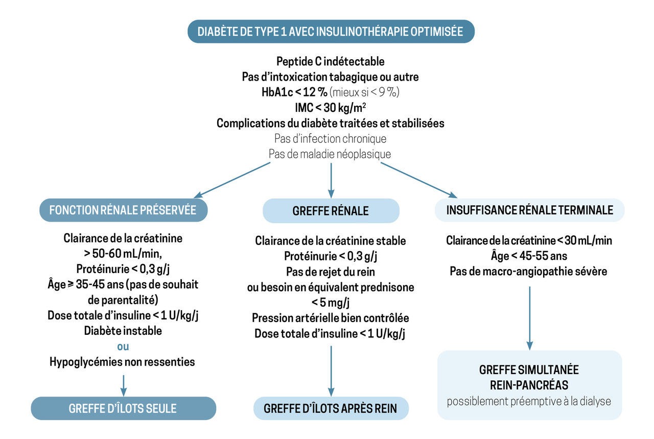Une greffe d’îlots seuls peut également être proposée chez des patients plus âgés (> 35-45 ans) avec un diabète instable insulino-dépendant depuis au moins cinq ans, en échec ou refus d’approches technologiques (