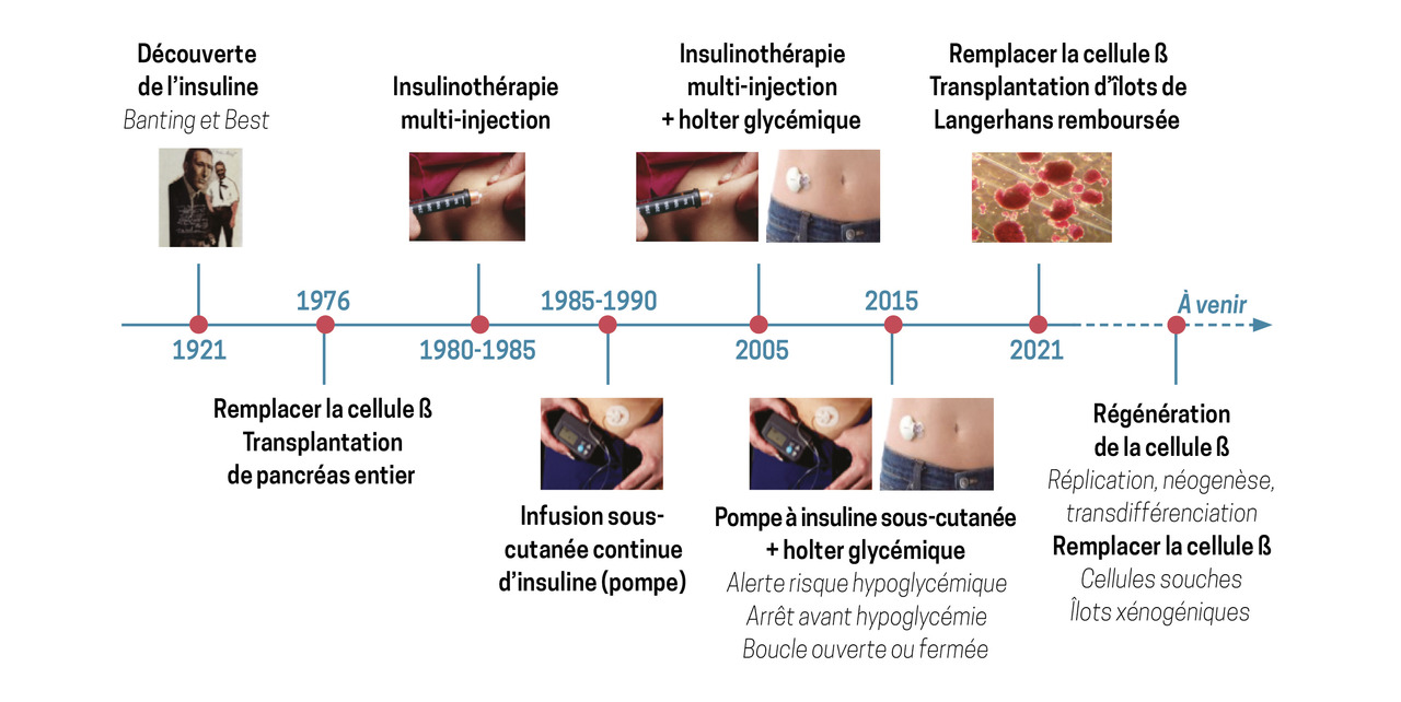 La greffe d’îlots de Langerhans consiste à injecter des cellules pancréatiques endocrines, permettant de restaurer conjointement une insulinosécrétion endogène et la perception des hypoglycémies.6