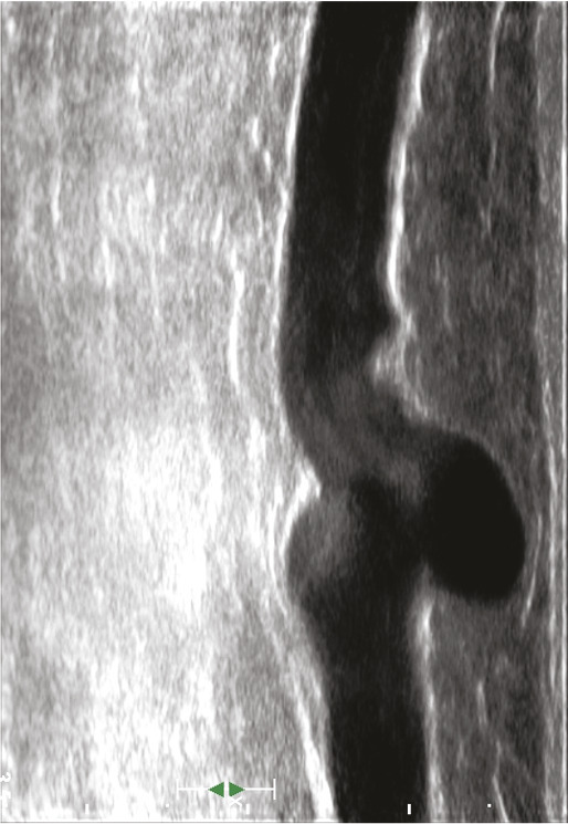 L’échographie en mode B, qui fournit une simple imagerie tissulaire, est utilisée pour identifier le réseau veineux superficiel, analyser les trajets veineux, mesurer le diamètre des veines pathologiques et analyser leur paroi et leur système valvulaire (fig. 12 et 13).
