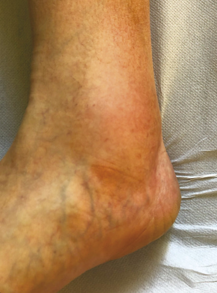 L’œdème veineux est classifié C3. Il est classiquement situé au niveau de la cheville, voire au tiers inférieur de la jambe (fig. 4 ). Il s’agit d’un œdème qui se majore au fil de la journée (œdème vespéral) et qui est favorisé par la station debout prolongée et par la chaleur. Il témoigne du retentissement tissulaire de l’hyperpression veineuse secondaire à la maladie variqueuse.