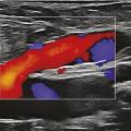 L’écho-Doppler couleur fournit une image des flux qui se superpose à l’image échographique. Cette technique permet d’analyser le sens d’écoulement des flux et leur vitesse de façon semi-quantitative. Par convention, les flux qui se dirigent vers la sonde échographique sont colorisés en rouge et ceux qui fuient la sonde échographique en bleu. Dans les veines saines, le bon fonctionnement du système valvulaire n’autorise qu’un écoulement antérograde en direction du cœur (colorisé en bleu compte tenu de l’orientation de la sonde échographique) dans le système veineux superficiel et profond. Du fait de l’incompétence valvulaire dans les veines variqueuses, on observe, après mobilisation de la colonne sanguine dans le sens antérograde, un reflux colorisé en rouge (fig. 14).