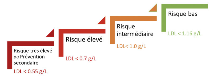 Les objectifs cibles sont fonction du risque cardiovasculaire du patient. Il faut distinguer l’objectif idéal et le seuil justifiant un traitement médicamenteux.