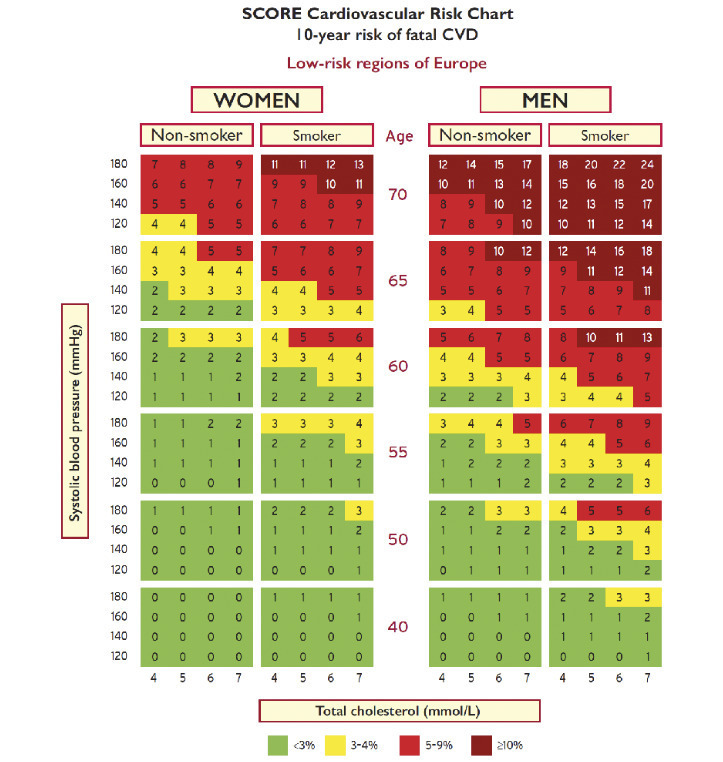 SCORE existe en deux versions pour les pays à bas et haut risque. Maladie cardiovasculaire, diabète compliqué ou non, insuffisance rénale et hypercholestérolémie génétique sont associés en eux-mêmes à un certain degré de risque.
