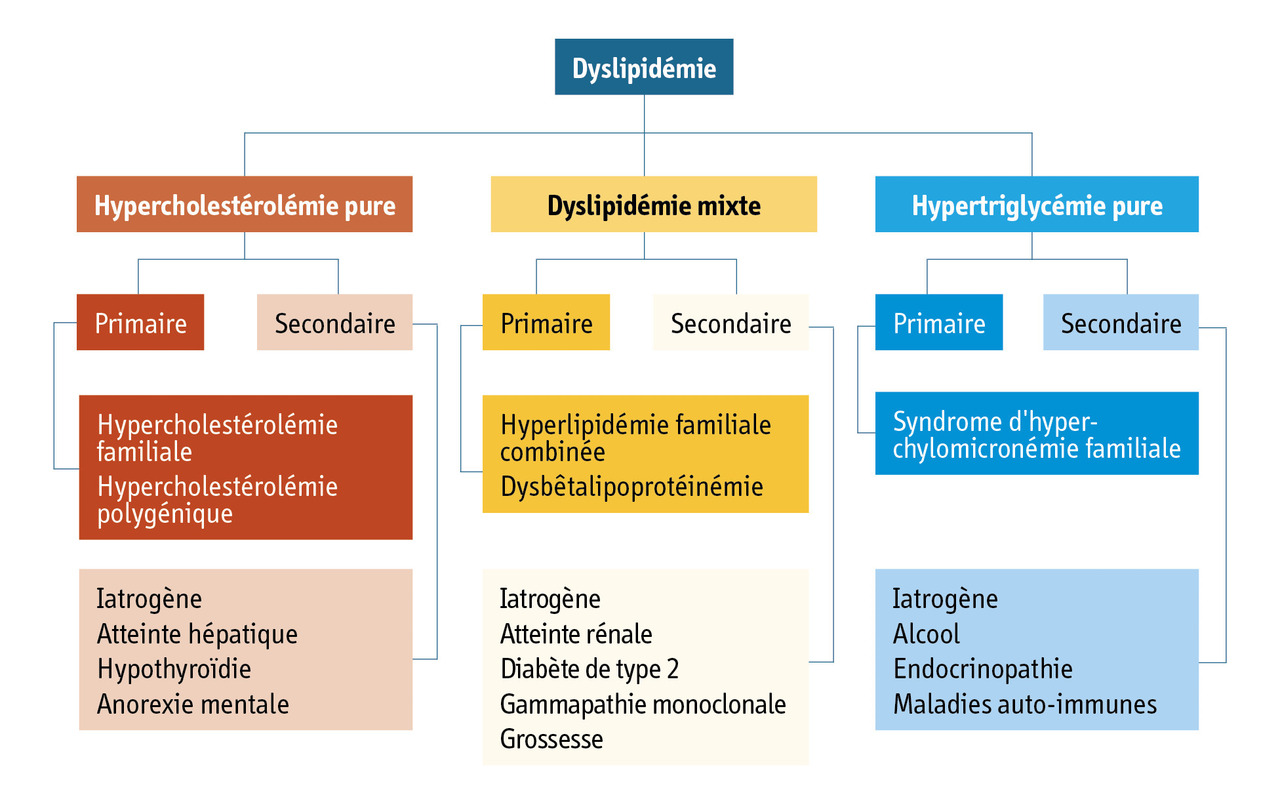 Dans le diagnostic d’une dyslipidémie, avant d’introduire un traitement hypolipémiant, il est important d’exclure une cause secondaire. Les hyperlipidémies secondaires s’améliorent avec un traitement à visée étiologique, sans employer d’hypolipémiants, ici inutiles, voire dangereux dans certaines situations.