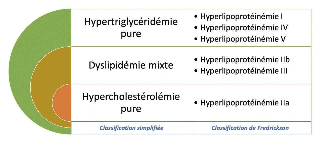 On peut individualiser en pratique clinique courante trois grands types de dyslipidémies selon le phénotype : l’hypercholestérolémie pure, l’hypertriglycéridémie pure et l’hyperlipidémie mixte avec augmentation conjointe de la cholestérolémie et de la triglycéridémie. Il est toutefois indispensable de savoir repérer des formes rares mais graves de dyslipidémies, par exemple les hyperchylomicronémies familiales (