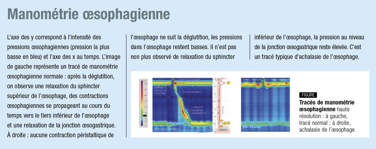 L’examen de première intention en cas de suspicion de trouble moteur de l’œsophage est la manométrie œsophagienne. Une sonde comportant des capteurs de pression est placée par le nez dans l’œsophage jusqu’à l’estomac. Les pressions œsophagiennes sont enregistrées au repos et après déglutition de liquides et/ou de solides. Normalement, la manométrie montre, après déglutition, une séquence de contractions œsophagiennes propagées de façon aborale et une relaxation du sphincter inférieur de l’œsophage. Le transit baryté de l’œsophage peut permettre de visualiser de façon dynamique la progression d’un bolus radio-opaque dans l’œsophage, mais les indications qu’il apporte sont peu spécifiques, et sa place se trouve uniquement en complément de la manométrie