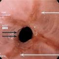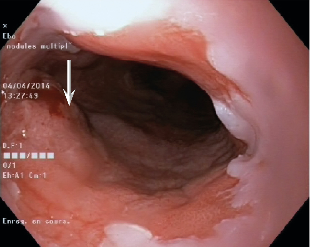 fig. 2 ) favorisé par le reflux gastro-œsophagien. Dans ce cas, au cours de la fibroscopie œsogastroduodénale, des biopsies de la masse tumorale sont réalisées pour diagnostic anatomopathologique. La lumière œsophagienne peut être également rétrécie sous l’effet d’une compression extrinsèque, la muqueuse est alors normale. Il convient alors de réaliser une imagerie de coupe de type tomodensitométrie thoracique à la recherche d’un processus tumoral cervical ou thoracique (adénopathies du hile pulmonaire, etc.).