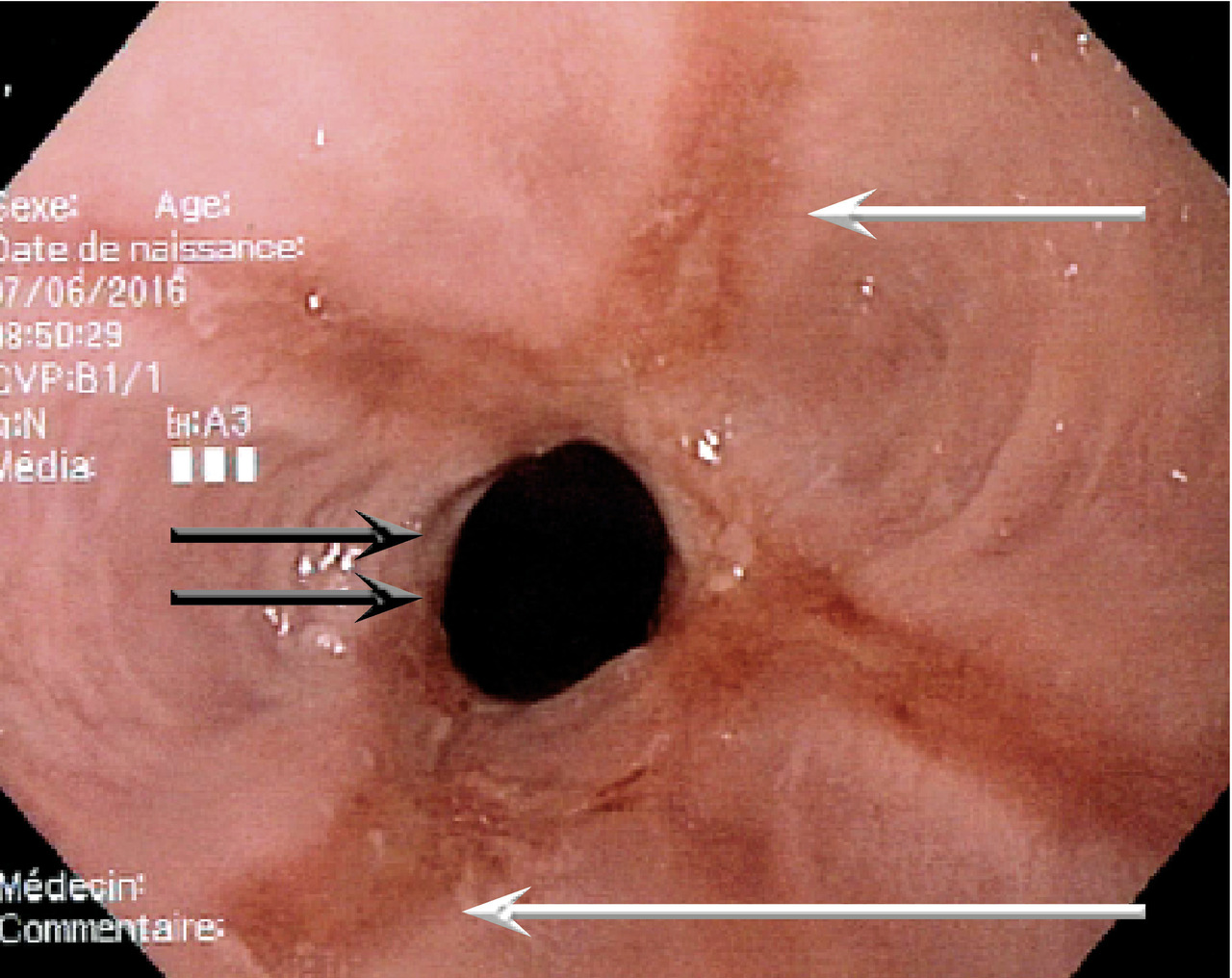 fig. 3 ) est liée à une cicatrisation anormale après une œsophagite peptique liée au reflux gastro-œsophagien. Un reflux gastro-œsophagien connu ou un pyrosis ancien sont souvent retrouvés à l’interrogatoire. Des sténoses peuvent également être causées par certains médicaments (bisphosphonates, AINS, etc.) ou par l’ingestion de produits caustiques. L’œsophagite disséquante est une pathologie rare de la couche superficielle de la muqueuse œsophagienne qui se détache en lambeaux et crée des sténoses annulaires. Le diagnostic est anatomopathologique, grâce aux biopsies réalisées au cours de la fibroscopie œsogastroduodénale.