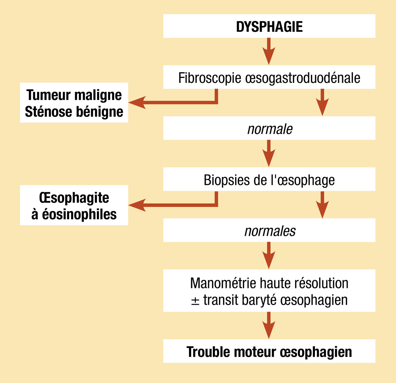 En l’absence de cause obstructive, une manométrie œsophagienne doit être réalisée à la recherche d’un trouble moteur de l’œsophage.